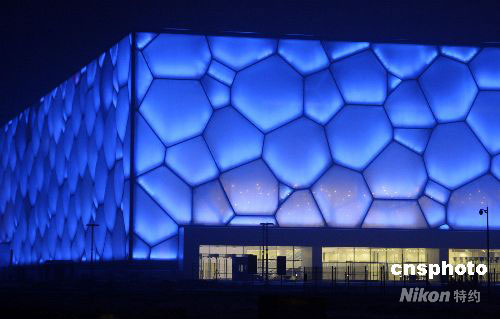 2008年1月19日晚,北京奥运工程之一的国家游泳馆(“水立方”)进行调试造型灯光,“水立方”中每个气泡被照射上蓝色灯光,令人畅想奥运水世界。中新社发 吴芒子 摄