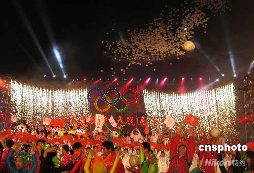 演员和观众振臂欢呼,台上台下焰火辉映,共同期待一百天后的北京奥运盛会。 中新社发 潘海涛 摄