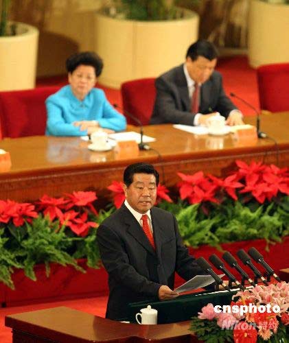 贾庆林在北京奥运会倒计时100天誓师大会上致辞。中新社发 任海霞 摄