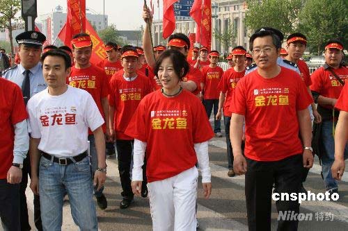 4月30日,北京奥运会迎来开幕倒计时100天,天津迎奥运万人健步走活动启动。2000年悉尼奥运会竞走冠军王丽萍(中)与万余名天津市民一起,步行4.5公里,宣传奥运,祝福奥运。 中新社发 田齐 摄