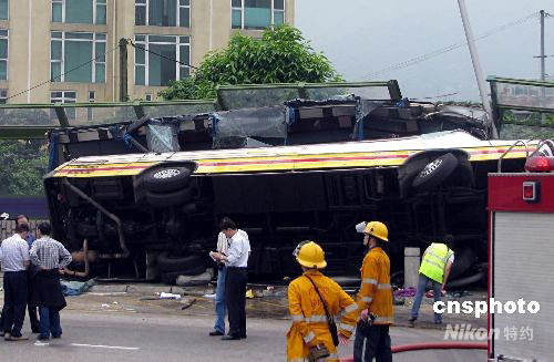 五月一日,香港发生严重交通意外,一旅游巴由黄大仙驶往西贡经南边围回旋处时翻侧,造成至少十八人死亡、四十余人受伤。初步调查显示,涉祸旅游巴超速及超载,肇事司机涉嫌危险驾驶已被拘捕。大批救护人员在现场参与抢救。中新社发 周文菁 摄