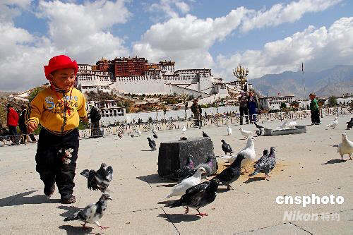 小童与鸽子嬉戏在布达拉宫广场。中新社发 张权 摄
