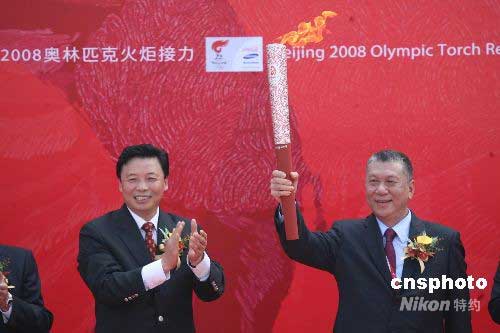 图为澳门特别行政区行政长官何厚铧(右) 、北京奥组委执行副主席杨树安等出席起跑仪式。中新社发 武仲林 摄