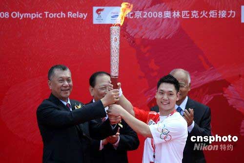图为澳门特别行政区行政长官何厚铧将火炬交给首棒火炬手、武术运动员梁洪敏。中新社发 武仲林 摄