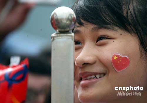 图为澳门少女激情迎接奥运圣火。中新社发 武仲林 摄
