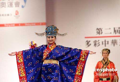 五月三日,香港各界青少年迎奥运系列活动委员会在香港会展中心举办“多彩中华迎奥运 人文奥运大汇演”。图为模特在先进灯光效果衬托下,展示珍贵历史服饰。中新社发 洪少葵 摄