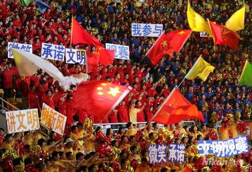 5月4日,“微笑北京、志愿奥运——北京奥运会、残奥会志愿者誓师大会”在北京举行,来自北京多所大学的学生代表所有志愿者,手举标语、挥舞国旗,并庄严宣誓。据悉,北京奥运会、残奥会赛会志愿者报名人数超过112万,城市志愿者人数超过157万。中新社发 张宇 摄