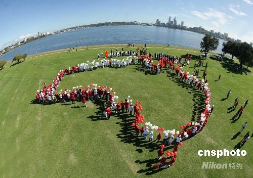 三所西澳大利亚中文学校的二百多名7-14岁的孩子在西澳首府珀斯天鹅河畔,组成北京奥运会徽图及澳大利亚地图表达对北京奥运的支持。中新社发 高周丹 摄