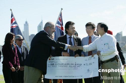 13个西澳华人社团的代表向西澳参加北京奥运的运动员捐赠了五万澳币(近四十万人民币),表达西澳洲华人对澳大利亚体育事业的支持。 中新社发 高周丹 摄