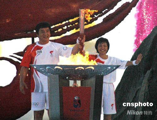 图:成龙与三亚女镇长共同点燃三亚圣火盆 (2)