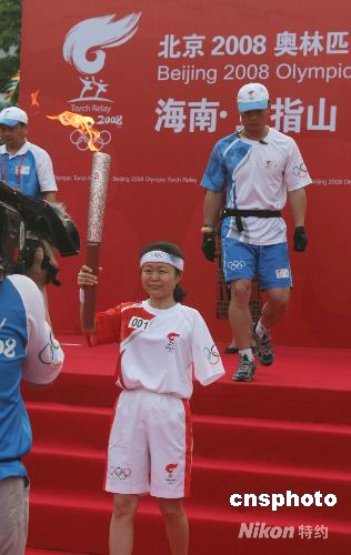 5月5日7时5分,北京奥运圣火开始在内地接力传递的第二站海南省五指山市传递,第十二届残奥会冠军黎玉强传递第一棒奥运圣火。中新社发 尹海明 摄