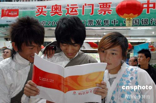 5月5日上午,北京奥运会第三阶段门票开始在拉萨销售,该销售工作与全国同步进行。奥运会门票的销售,引起了拉萨市民的极大热情。在西藏奥运会门票销售点的中国银行西藏自治区分行里,购买奥运会门票的市民排起了长长的队伍。图为西藏大学的学生在看购票参考手册。 中新社发 周波 摄