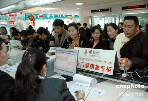 在西藏奥运会门票销售点的中国银行西藏自治区分行里,购买奥运会门票的市民排起了长长的队伍。 中新社发 周波 摄