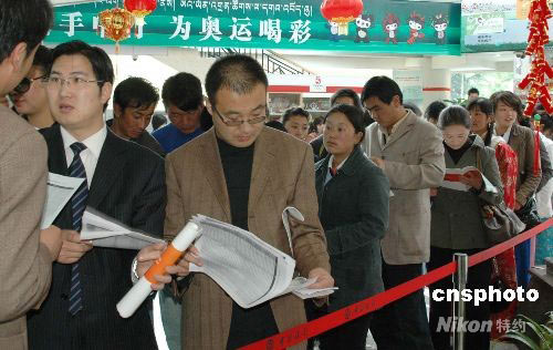 在西藏奥运会门票销售点的中国银行西藏自治区分行里,购买奥运会门票的市民排起了长长的队伍。 中新社发 周波 摄