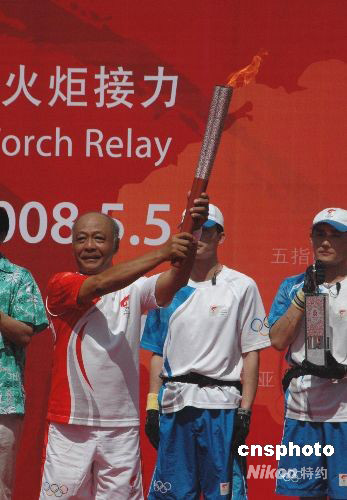今年63岁的华侨郑文泰作为第一棒火炬手在兴隆起跑仪式上高举火炬。 中新社发 王辛莉 摄