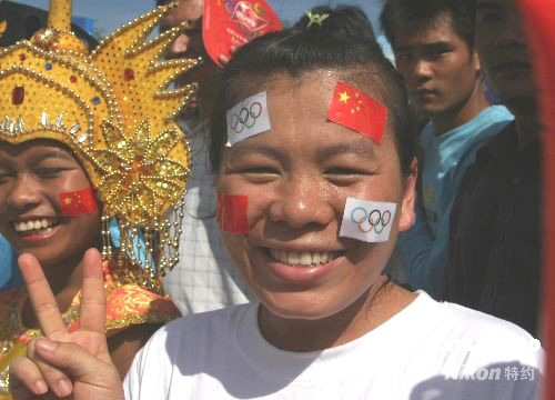 一名归侨女子在脸上贴满奥运五环旗和五星红旗,满怀欣喜迎圣火。中新社发 尹海明 摄