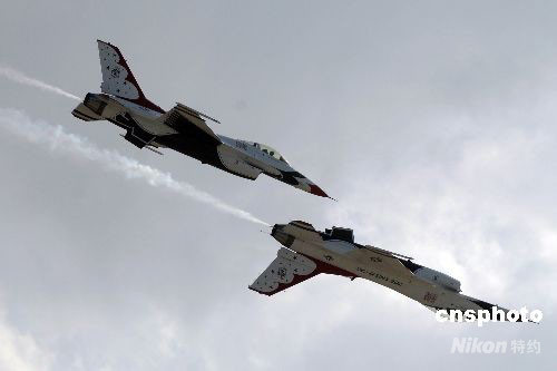 位于美国南加州河滨县的一个美国空军预备基地周日举行规模盛大的航空展和飞行表演。C-17A全球霸王运输机、C-5银河运输机等空中巨无霸和F-22猛禽战机等美军先进军用飞机亮相展览,F-22战机飞行表演、美国空军“雷鸟”飞行队的特技表演等令近十万民众大饱眼福。图为“雷鸟”飞行队表演惊险刺激的特技飞行。中新社发 张炜 摄