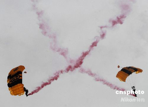 图为美军“金骑士”跳伞队表演“空中芭蕾”。中新社发 张炜 摄