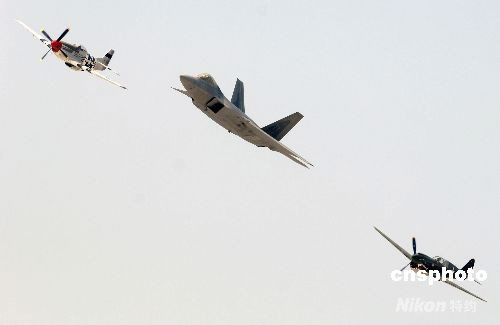 一架美军最先进的F-22猛禽战机(中)与二战时期的美军战机P-51和P-40空中共舞,让人们体验航空科技的突飞猛进。中新社发 张炜 摄