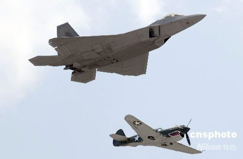 一架美军最先进的F-22猛禽战机与二战时期的美军战机P-40空中共舞,让人们体验航空科技的突飞猛进。中新社发 张炜 摄