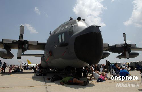 图为许多参观者在C-130大力神飞机阴影下休息。中新社发 张炜 摄