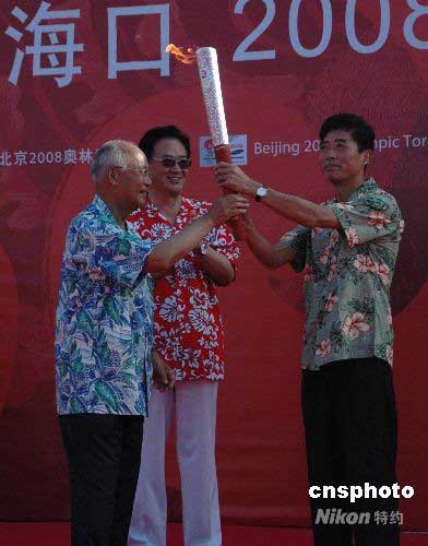 5月6日,北京奥运圣火开始在大陆境内第一个省会城市海口传递。图为北京奥组委执委、国际奥委会委员、中国奥委会名誉主席何振梁(左)作为圣火使者将火炬交接给中共海南省委副书记于迅(右一)。中新社发 王辛莉 摄