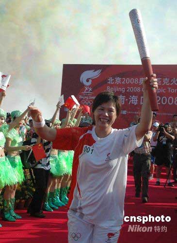 5月6日,北京奥运圣火在中国境内海口市传递,为海南省赢得第一枚金牌的帆板运动员王丽芳传递海口第一棒。图为她从起点仪式上起跑。中新社发 王辛莉 摄