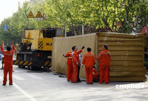 5月6日下午,在上海宝山区淞滨西路同济路口,一辆集装箱卡车上的集装箱从十多米的高架引桥处坠落,导致3人被砸死,多人受伤。中新社发 宣克炅 摄