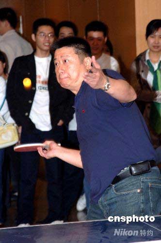 5月7日,福建厦门籍北京奥运火炬手郭跃华在福州出席一项全民健康万人健步跑活动新闻发布会时,与球迷切磋乒乓技艺。郭跃华是中国第一个世界杯男子单打冠军,也是中国运动员中唯一一个连续四次打进世乒赛决赛的选手。 中新社发 王东明 摄