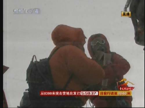 中国登山队奥运圣火登顶珠峰突击队8日凌晨向珠峰峰顶发起冲击。图为电视截图。