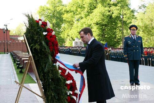 俄罗斯新任总统梅德韦杰夫来到克里姆林宫西北侧红墙下的亚历山大花园,向无名烈士墓敬献花圈,纪念卫国战争胜利63周年。这是梅德韦杰夫就任总统后的首场正式活动。中新社发 田冰 摄