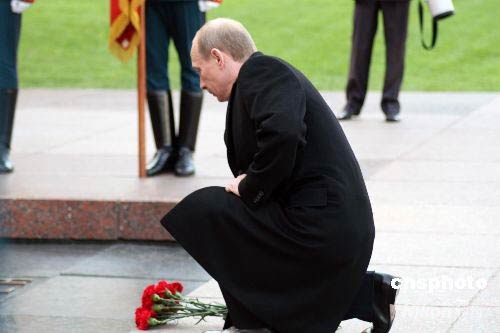 俄罗斯前任总统普京来到克里姆林宫西北侧红墙下,向无名烈士墓敬献花圈,纪念卫国战争胜利63周年。中新社发 田冰 摄
