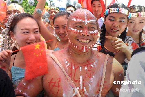 图为世界之窗的外国演员在道旁欢呼圣火传递。 中新社发 廖攀 摄