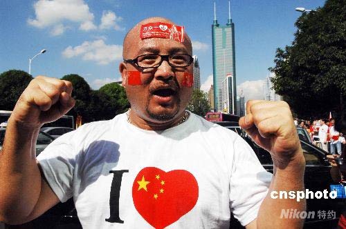图为深圳民众激情迎奥运。 中新社发 陈文 摄