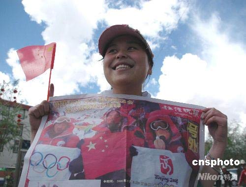 5月8日上午9时许,奥运圣火成功登上珠峰后,拉萨街头一片欢腾,市民欢天喜地奔走相告。拉萨的平面主流媒体《拉萨晚报》,全面刊登了奥运圣火登珠峰的详细消息,一些热心市民自发走上街头,发送报纸,引得市民争相观看。 中新社发 周波 摄