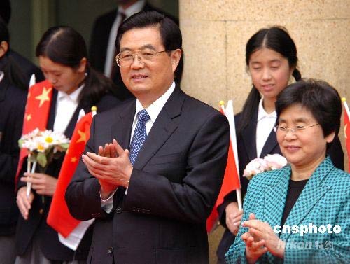 5月9日下午,正在日本进行国事访问的中国国家主席胡锦涛及夫人刘永清参观了横滨山手中华学校,受到该校全体师生的热烈欢迎。图为胡锦涛夫妇在欢迎仪式上。中新社发 朱沿华 摄
