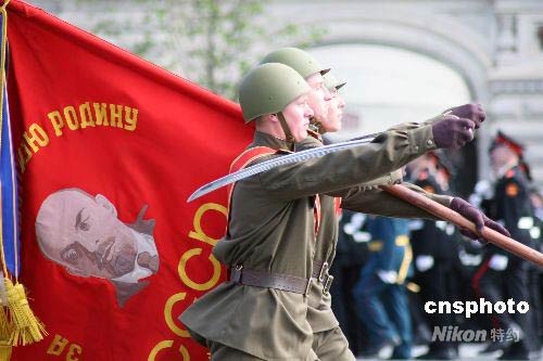 5月9日,俄罗斯在莫斯科红场举行盛大阅兵式,庆祝卫国战争胜利63周年。俄罗斯总统梅德韦杰夫和总理普京等出席阅兵仪式。图为身穿二战时期苏联军服的士兵接受检阅。中新社发 田冰 摄