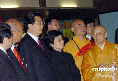 5月9日上午,胡锦涛及夫人刘永清在日本奈良冒雨参观了著名的唐招提寺。图为该寺长老在向胡锦涛夫妇介绍御影堂中陈列的日本国宝——鉴真和尚坐像。中新社发 朱沿华 摄