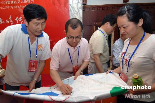 5月10日,在福州参加2008北京奥运会火炬接力境内传递福州站火炬手接待大会的部分火炬手,在一面奥运五环旗上签名。奥运圣火11日将在福建省福州市进行传递,路线全程为28.6公里,由208名火炬手完成。中新社发 刘可耕 摄