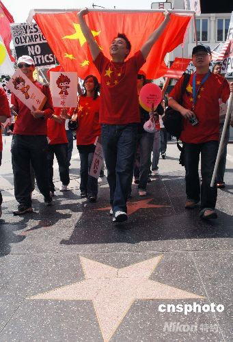 通过网络自发组织的南加州数百名华人华侨、留学生在洛杉矶著名的好莱坞星光大道上举行支持北京奥运集会游行活动。中新社发 张炜 摄