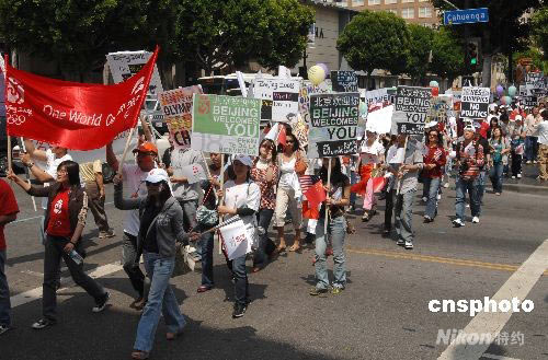 游行结束后,大家聚集到柯达剧场门口,憨态可掬的福娃、激情澎湃的歌声、饱含深情的诗朗诵将本次活动带入到高潮。 中新社发 张炜 摄