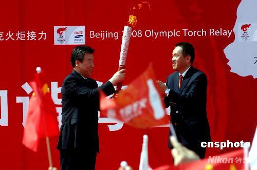 5月11日上午9点40分左右,北京奥运会火炬接力境内福建福州站起跑仪式在福州五一广场隆重举行。图为中共福建省委书记卢展工(左)从北京奥组委官员张矛手中接过火炬。