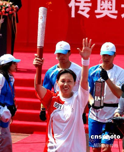 福建籍的奥运冠军、中国女排名将郑美珠跑出奥运圣火福建传递首站福州站的第一棒。中新社发 刘可耕 摄
