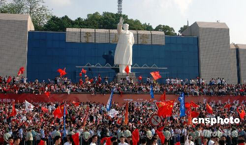 图为福州市民围绕在毛主席雕塑下喜迎奥运圣火。 中新社发 王东明 摄