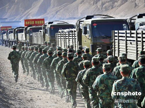 5月10日清晨,赴青藏线执行物资运输任务的中国汽车部队正规化出车。中新社发 吴苏琳 摄