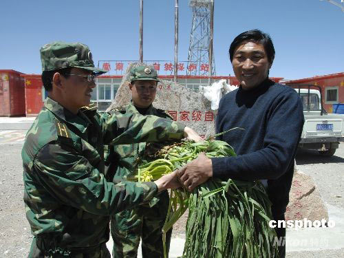 5月10日,青藏高原行车的中国汽车兵路过位于青海省可可西里国家自然保护区的索南达杰保护站,把新鲜的蔬菜和副食品送到工作人员手中。中新社发 吴苏琳 摄