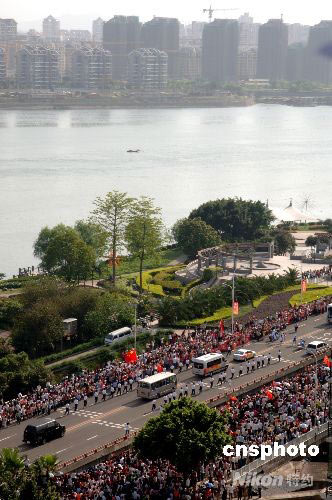5月11日下午,北京奥运火炬在福州最美的江滨大道进行传递,现场盛况空前。 中新社发 王东明 摄