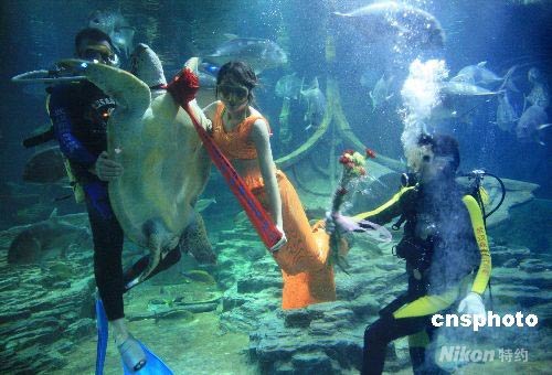 5月11日,在武汉东湖海洋世界,一只百岁雌性海龟“披红挂彩”,“接受”潜水员献上的康乃馨和“美人鱼”的亲吻,欢度“母亲节”。中新社发 王振武 摄