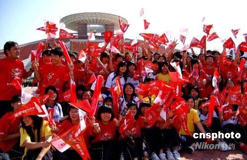 众多侨乡学子在泉州闽台缘博物馆沿途欢迎奥运圣火。中新社发 傅丹丹 摄