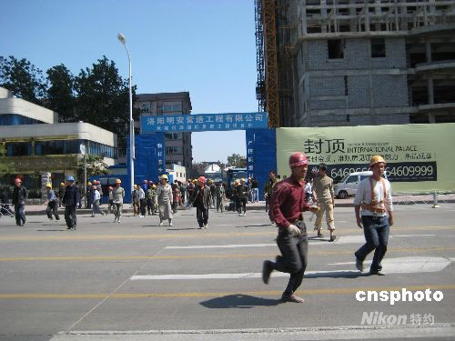 5月12日14时33分,河南洛阳发生有感地震,房屋和电灯摇摆明显,众多市民纷纷上街躲避,目前尚未发现人员和财产损失,震源和等级尚不明确。中新社发 巩卫东 摄